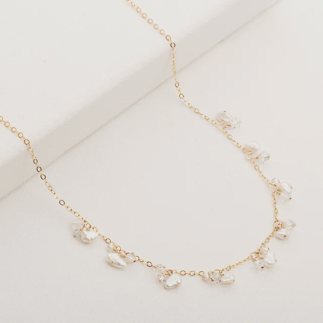 Spring Blossom Fringe Necklace - White Keshi Pearl/Austrian Crystal - 14KT Gold Filled