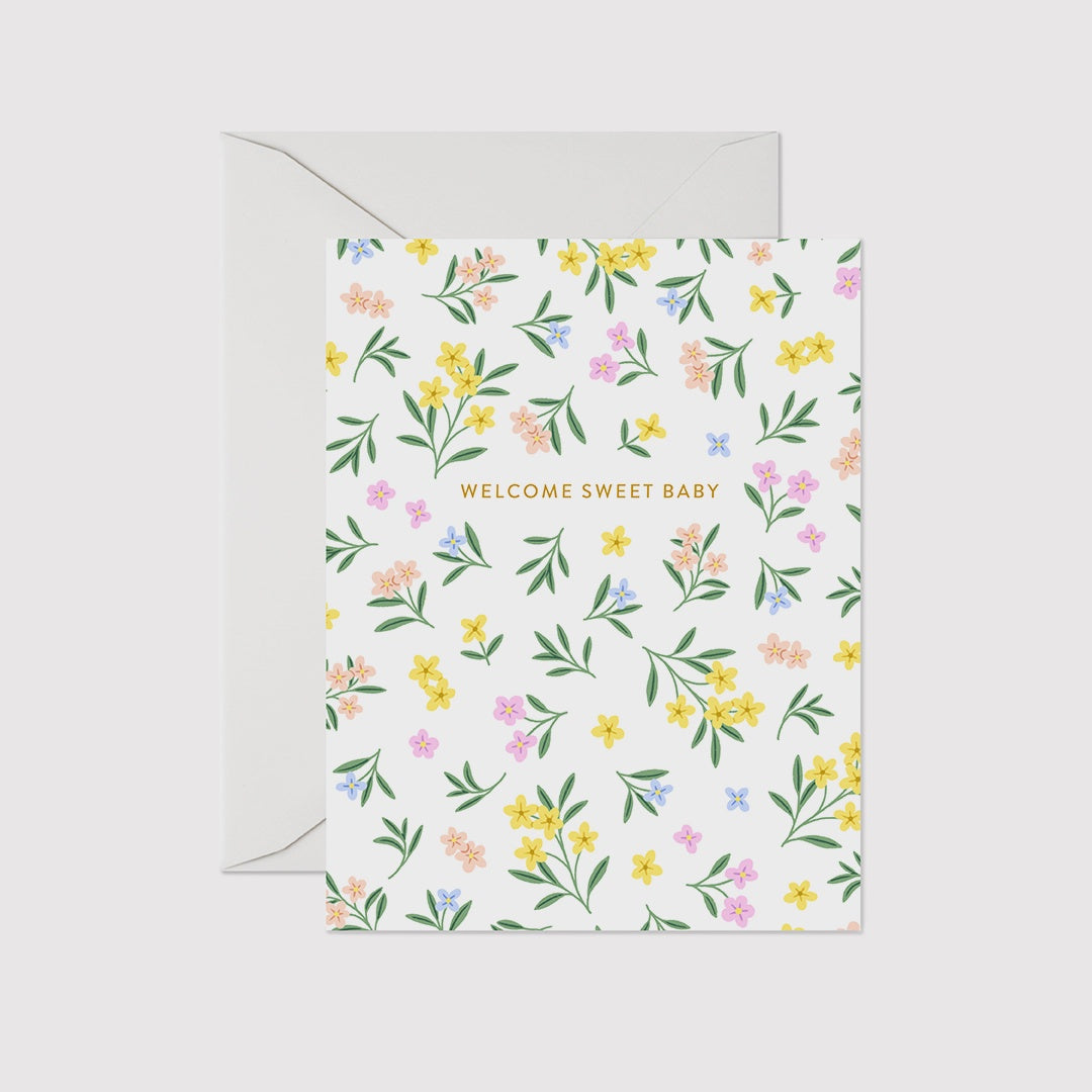 Celebrate the arrival of a precious little one with our charming baby greeting card, adorned with a light and delicate floral pattern.