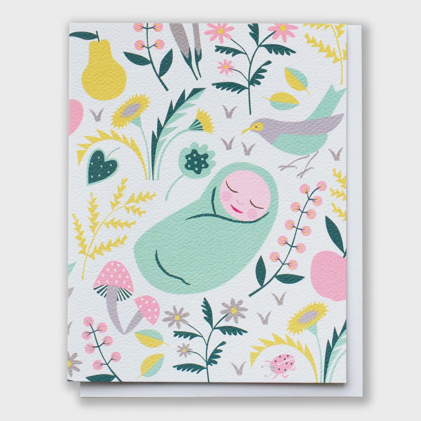 Welcome sweet wonder! A darling bundle of joy wrapped and swaddled in a meadow of flora and fauna. Songbirds, mushroom and fallen fruit.