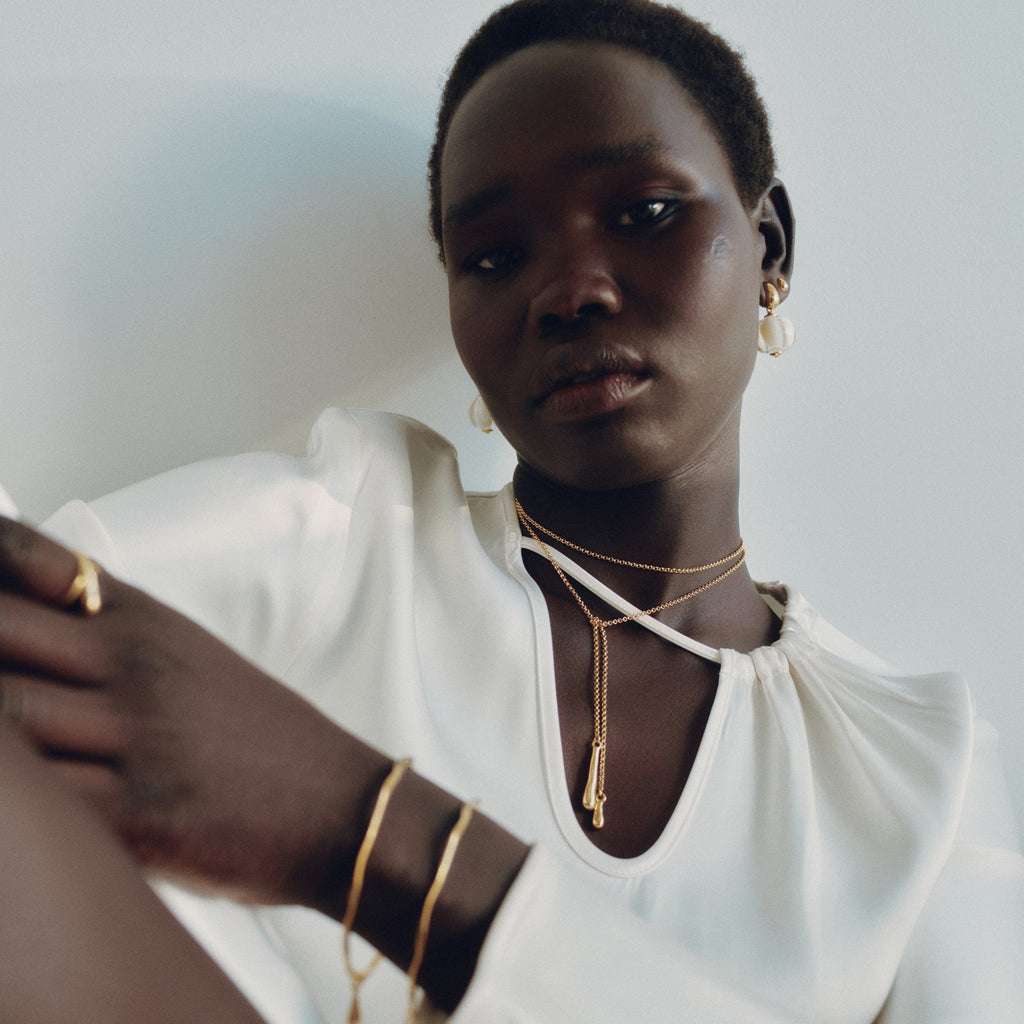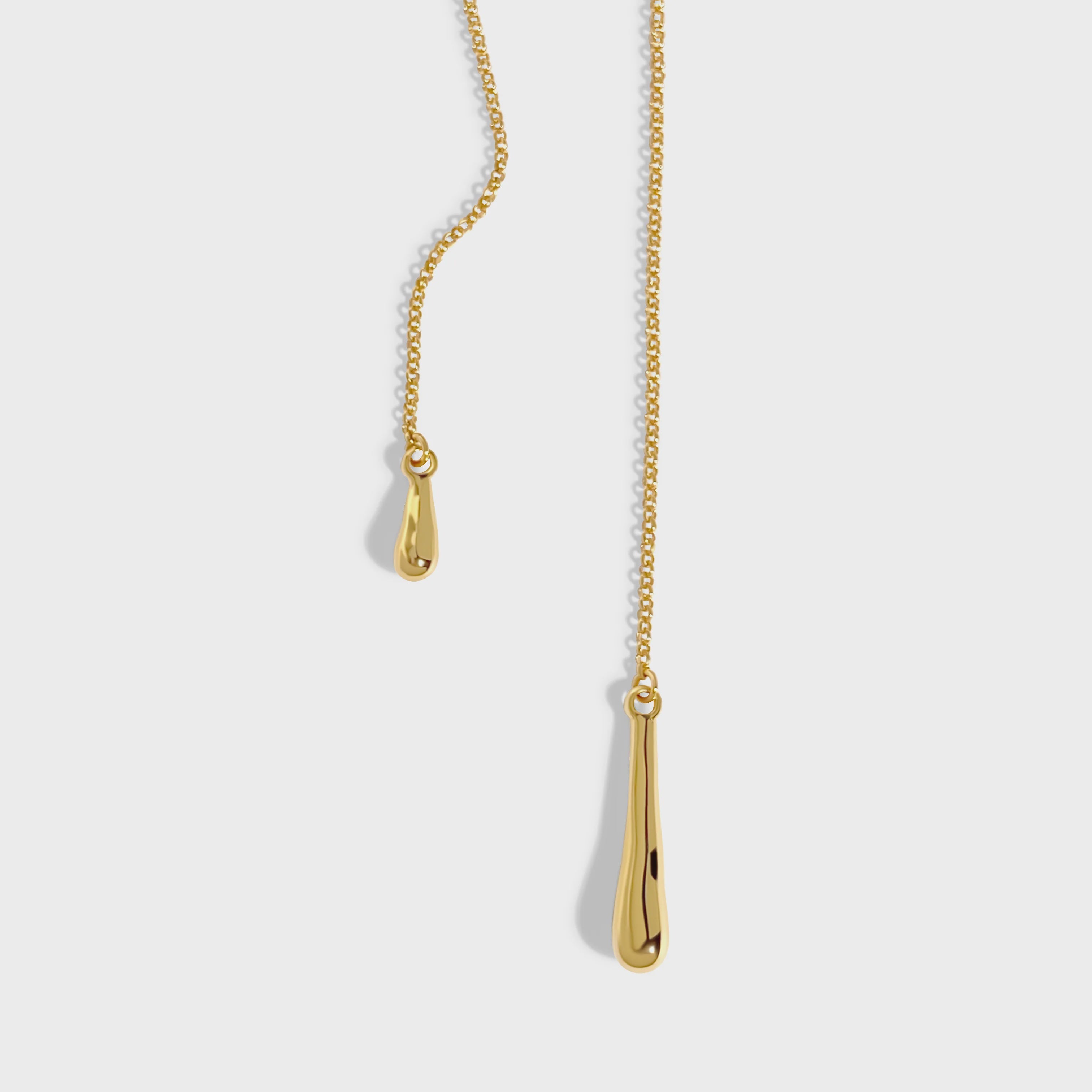 A duo of hand-formed molten droplets cascade from a minimal rolo chain, shifting effortlessly from cool-girl accent to everyday essential. This beauty is the ultimate multi-tasker—wear it long and tied, folded scarf-style for a shorter look, or wrapped once around for a chic choker effect. So many ways to wear, all yours to explore.