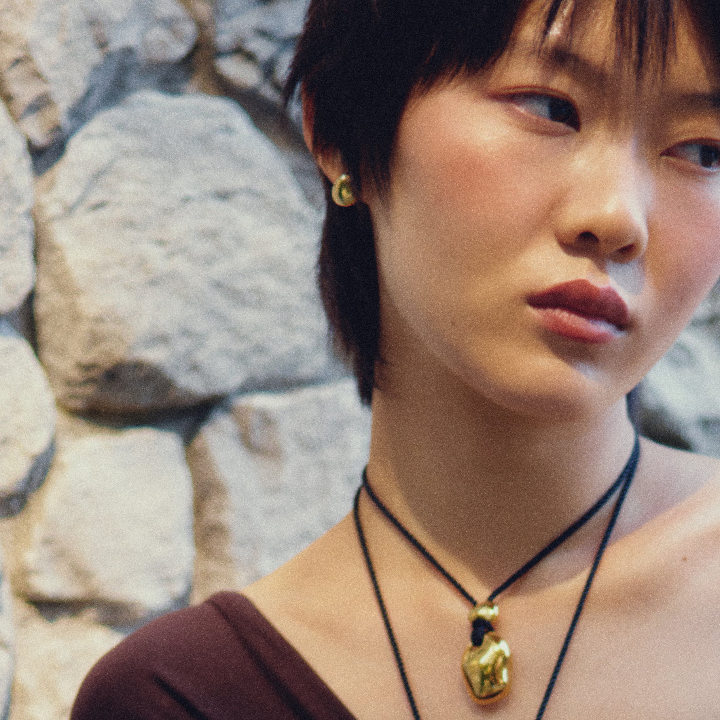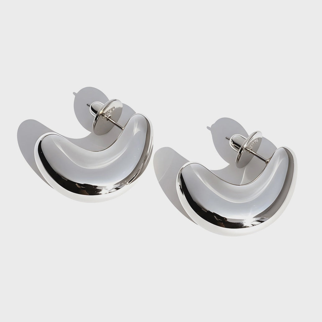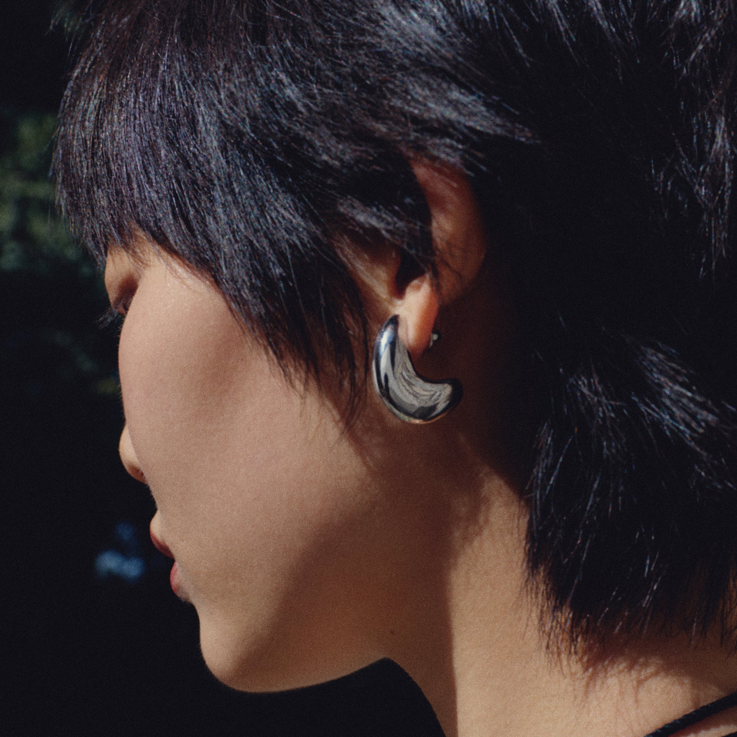 Handcrafted from a crescent-shaped pebble collected in Bolati, Greece in the summer of 2025, these high-shine hoops capture the playful, organic contours of nature. Their bold, sculptural form hugs the ear effortlessly, perfect for daily wear.