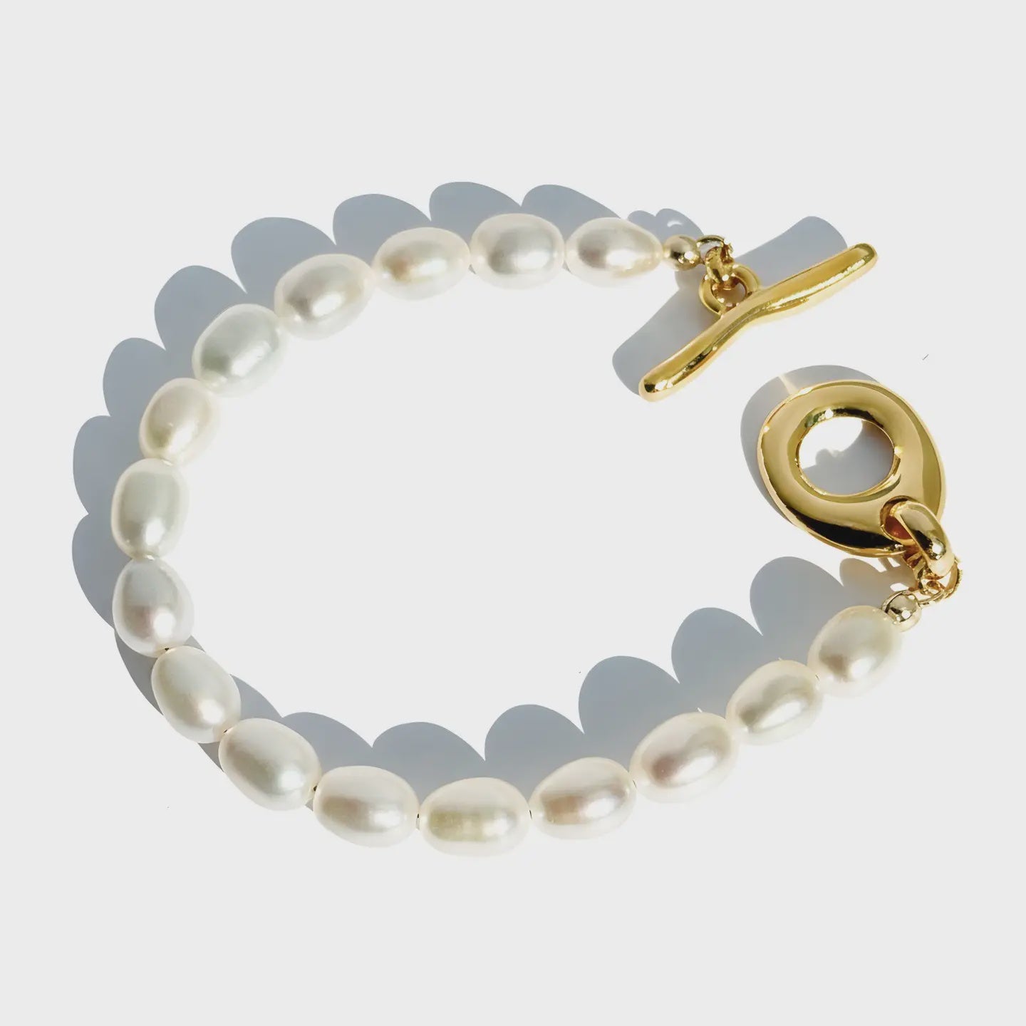 Named after Corrine’s grandmother, Tasia features a luminous stream of freshwater pearls and a custom toggle and bar crafted from a pebble found on her grandmother’s beach in Greece. This modern heirloom is rooted in nostalgia and designed for effortless, lasting wear.