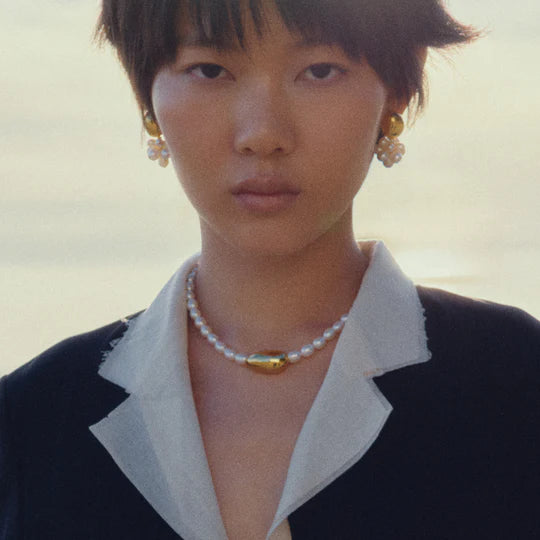 Named after Corrine’s grandmother, Tasia features luminous freshwater pearls grounded by a central oval pebble, hand-cast from a stone collected on her grandmother’s village beach in Greece. Each element is carefully strung and finished with a custom toggle and bar crafted from smaller pebble castings. A modern piece grounded in heritage and shaped by memory, made for effortless, lasting wear.