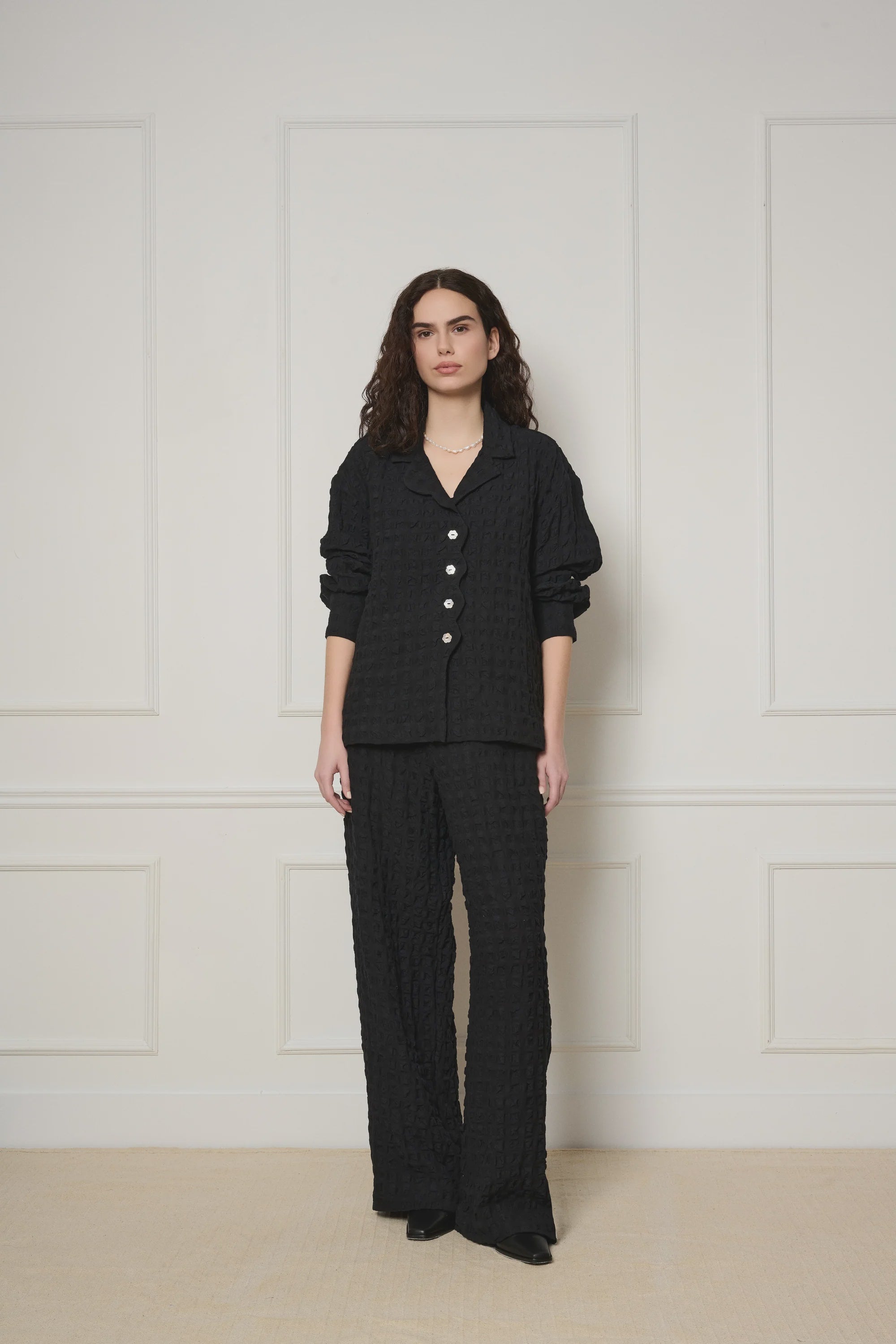 * Long sleeves and cuffs with seashell buttons