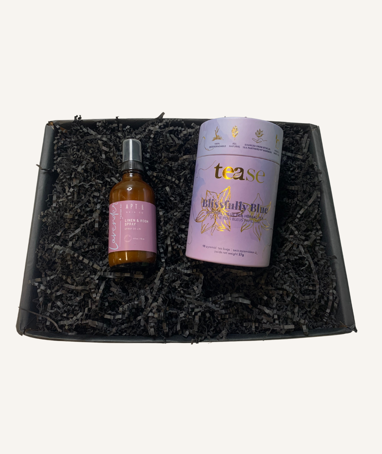 Unwind with this Canadian-made gift box designed to soothe the mind and body during stressful times. Sip on Tease's Blissfully Blue Tea, a calming blend of butterfly pea flower, apple, and ashwagandha that transforms from blue to purple with a splash of lemon. Enhance your space with Apt. 6's Lavender Linen & Room Spray, infusing your surroundings with the relaxing scent of lavender and bergamot. Perfect for creating a tranquil atmosphere to end your day or ease anxiety.