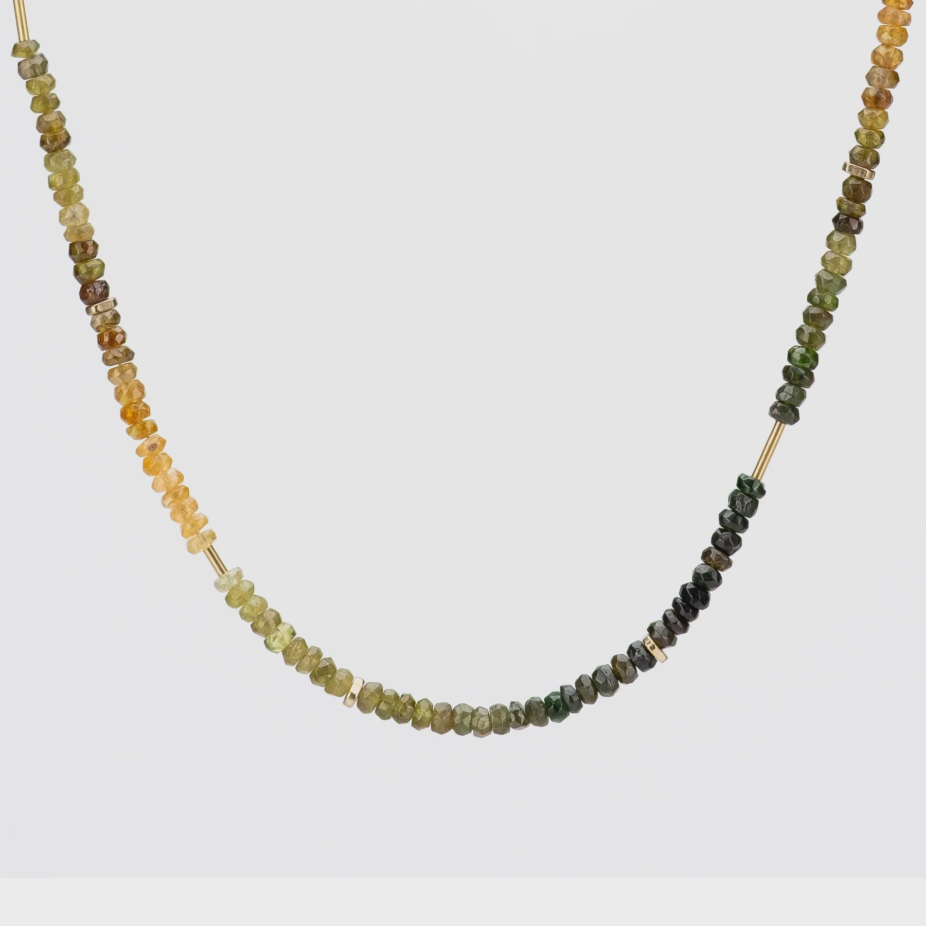 This necklace features an autumnal rainbow of Green Tourmaline accentuated by creative recycled brass accents (made from car parts and plumbing fixtures). A luxurious, one-of-a-kind piece, this necklace is truly special.