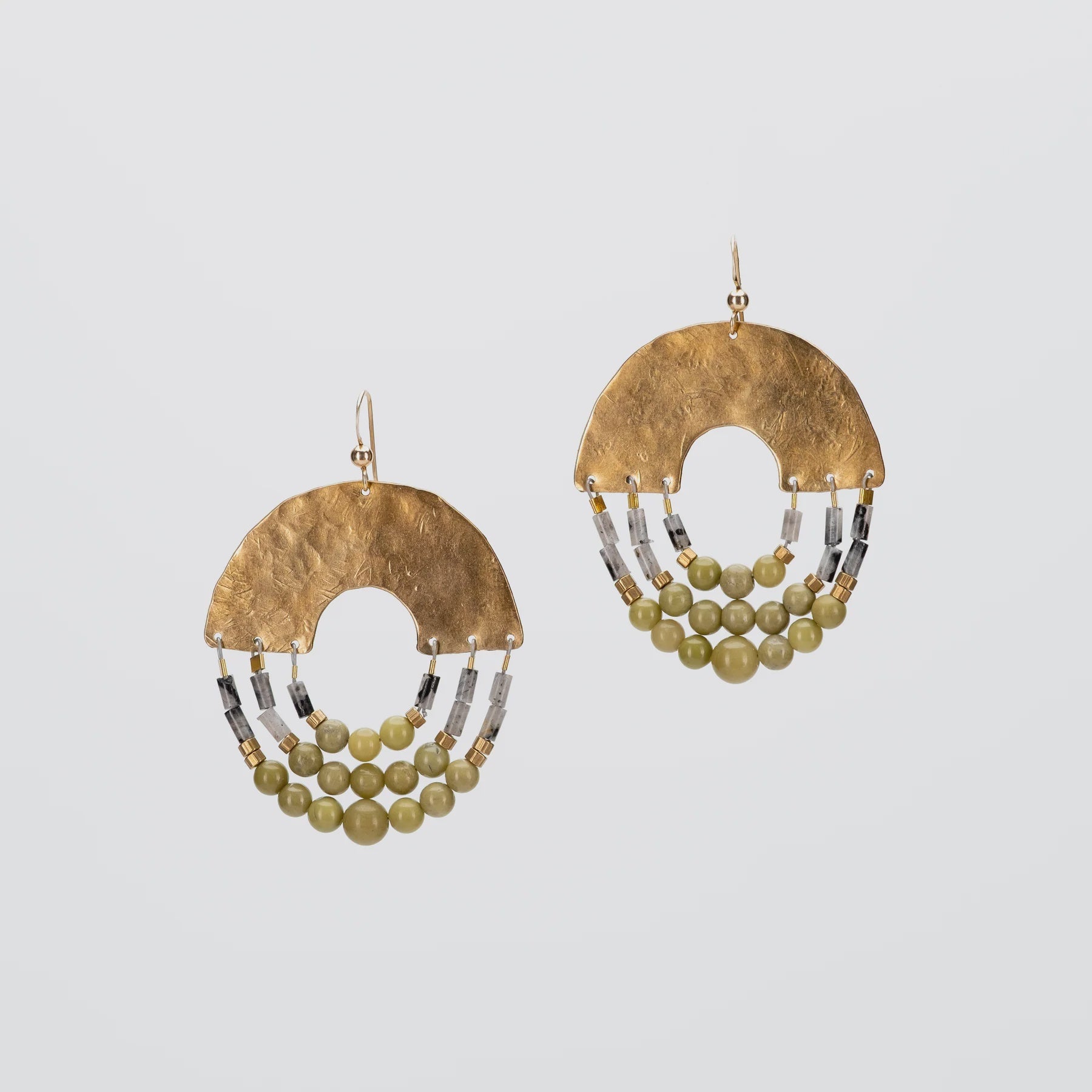 Modelled after Hailey’s own wedding earrings, the Fortuna Earrings are constructed from hand-hammered brass, Avocado Jasper & Black Labradorite accent stones at the top of each strand with 14K gold-fill earwires.