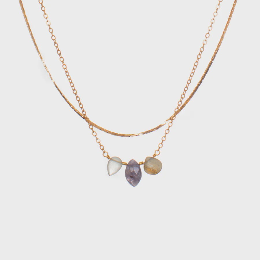 The Azure Necklace is simple enough for everyday, but still unique with its combination of colours, shapes and textures. Featuring hand-cut Iolite, Labradorite and Aquamarine paired with our signature reclaimed vintage brass chains, we love this necklace all on its own or combined with your favourite chains or beaded layers.