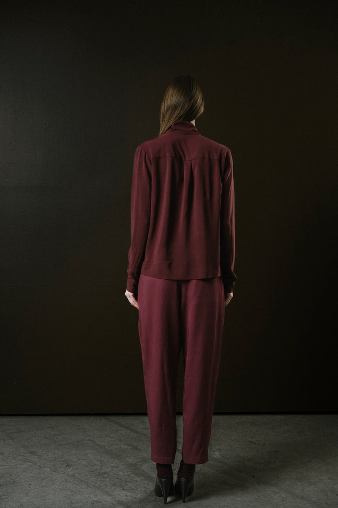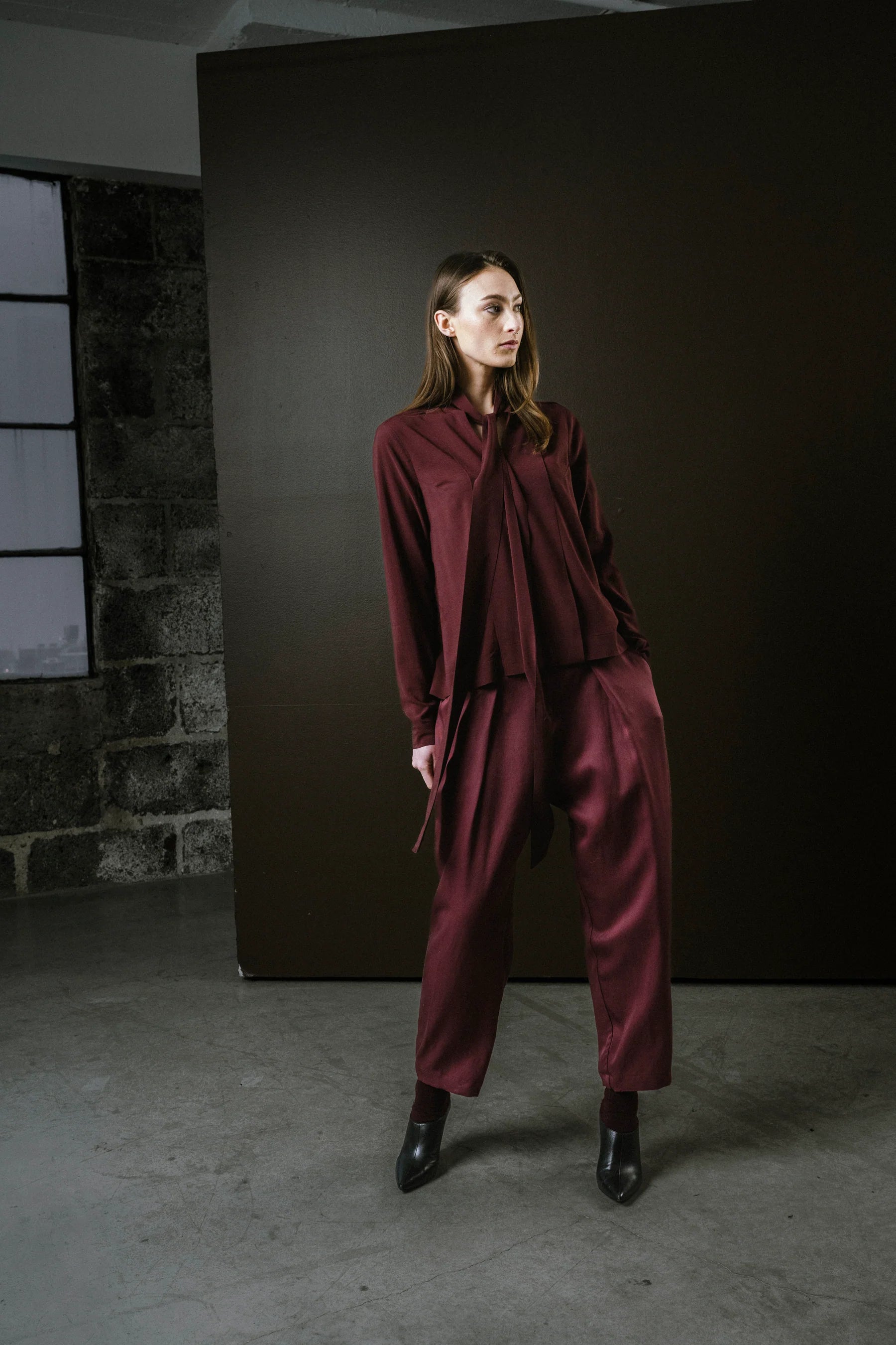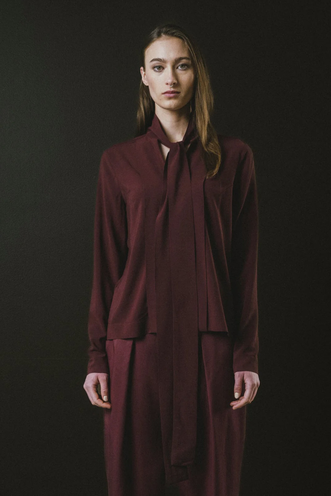 The relaxed silhouette features a long sleeve, a soft V-slit neckline under a fixed ascot tie, and a back pleat that adds ease and subtle movement. Ideal for refined layering or worn on its own.
