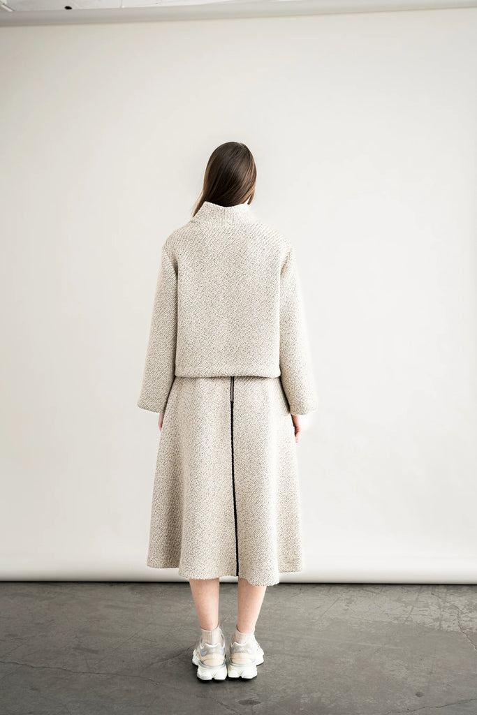 Crafted from a dense wool blend tweed and fully lined for comfort. The fabric holds shape without ribbing at cuffs or neckline, emphasizing simplicity.