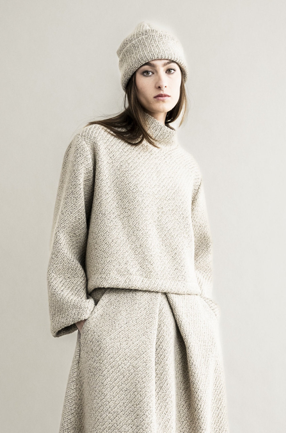Modern boxy sweater that merges classic tweed texture with clean, unfussy lines. Designed for a fresh take on traditional knitwear.