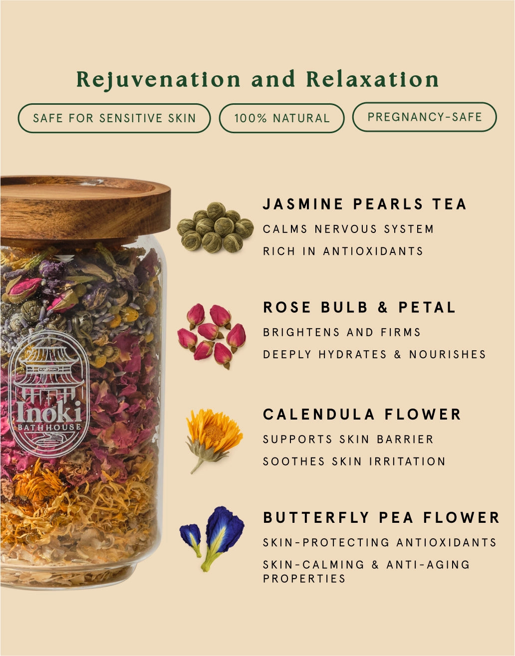 Organic Avena Sativa (Gluten-Free Oats), Organic Rosa Centifolia (Red Rose Bulbs and Rose Petals) Flowers, Organic Calendula Officinalis (Calendula) Flowers, Organic Cocos Nucifera Milk Powder (100% Pure Coconut Milk Powder), Organic Camellia Sinensis (Jasmine Pearls Tea), Organic Lavandula Angustifolia (Lavender) Flowers, Matricaria Recutita (Chamomile) Flowers, Organic Clitoria Ternatea (Butterfly Pea Flowers)