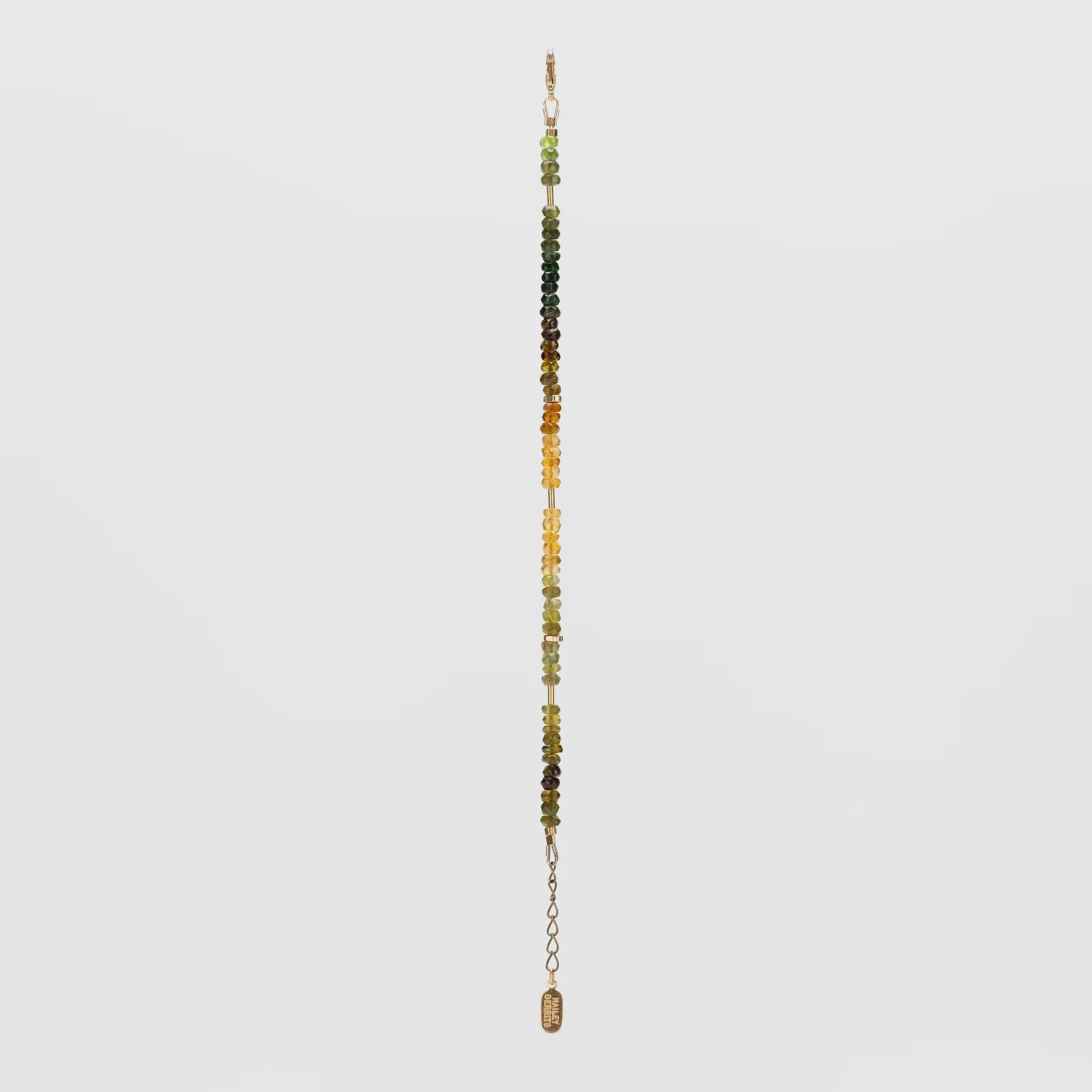 An autumnal rainbow of Green Tourmaline accented with recycled brass accents (made from car parts and plumbing fixtures). A luxurious, one-of-a-kind piece, this bracelet is a truly special addition to any look.