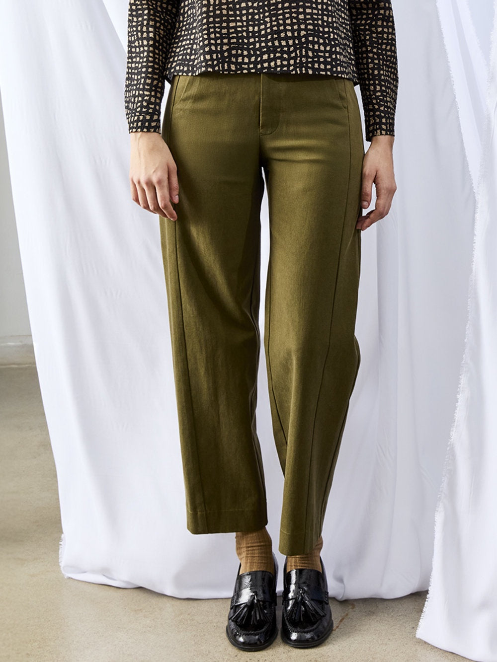 Barrel leg pant with front seam detail in a lovely organic cotton twill. Mid Rise. Front slant pockets. Elasticized back waistband for an easy fit. Fly front zipper closure. Inseam measures 27".