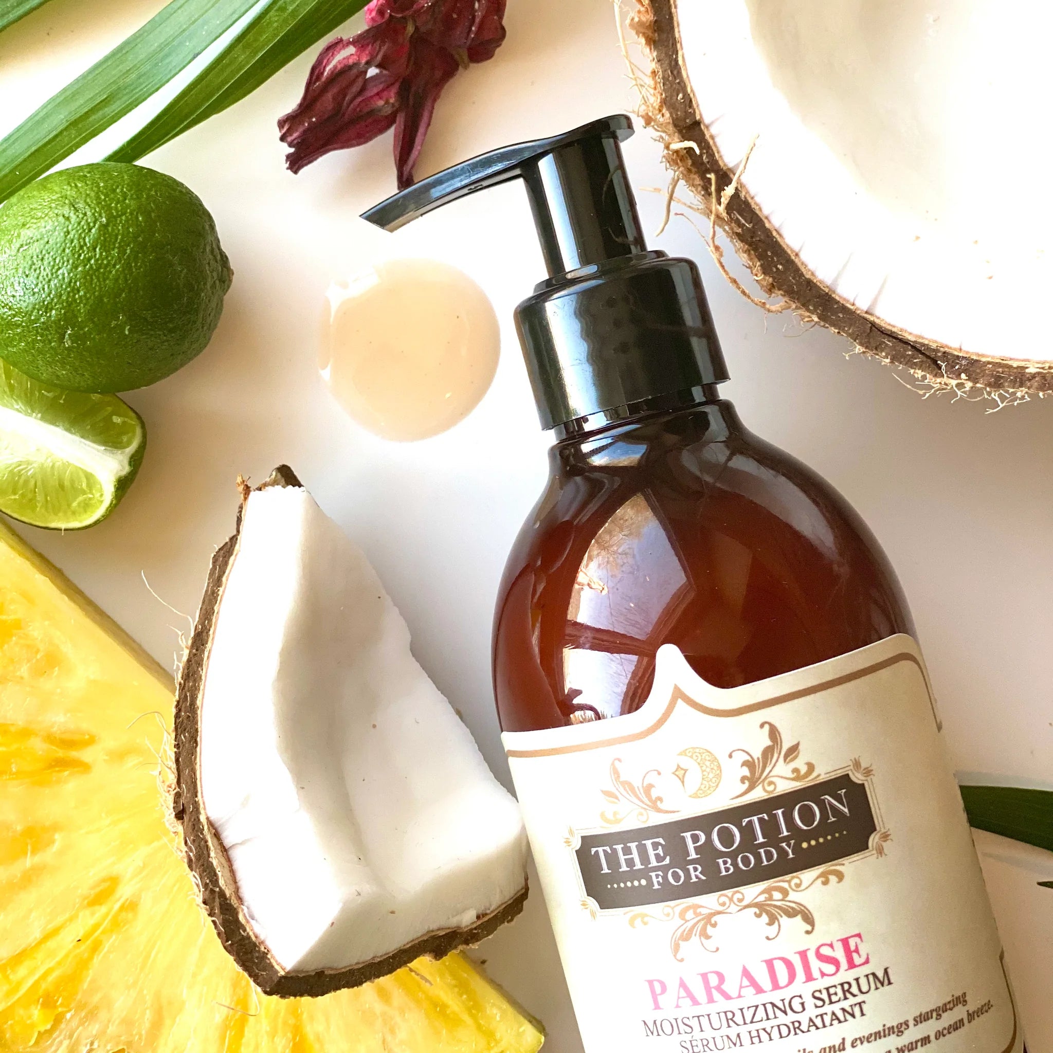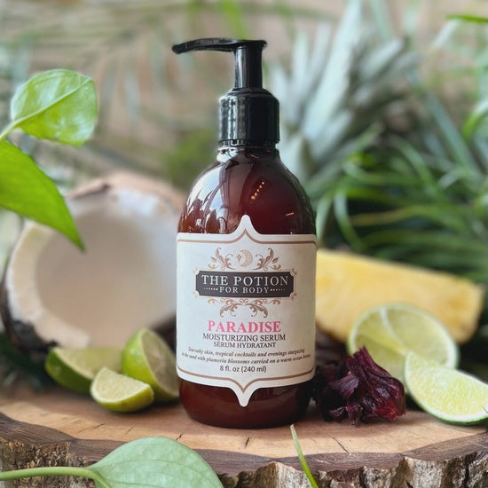 Paradise Body Potion takes you on a journey through the most magical moments of a tropical vacation. The top notes are a splash of fresh Lime Margarita and sweet Pina Colada. Middle notes of Tanning Oil and Sea-salty Skin bring to mind lazy days on sunny beaches. The lingering finish of this Potion recalls evenings of stargazing in the sand with blooming Plumeria and Hibiscus carried on a warm ocean breeze.