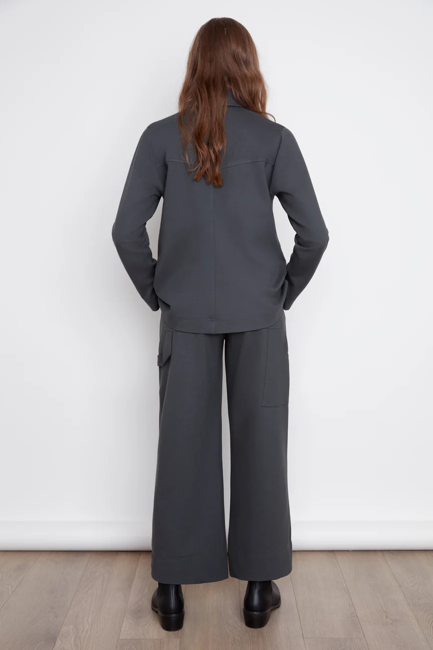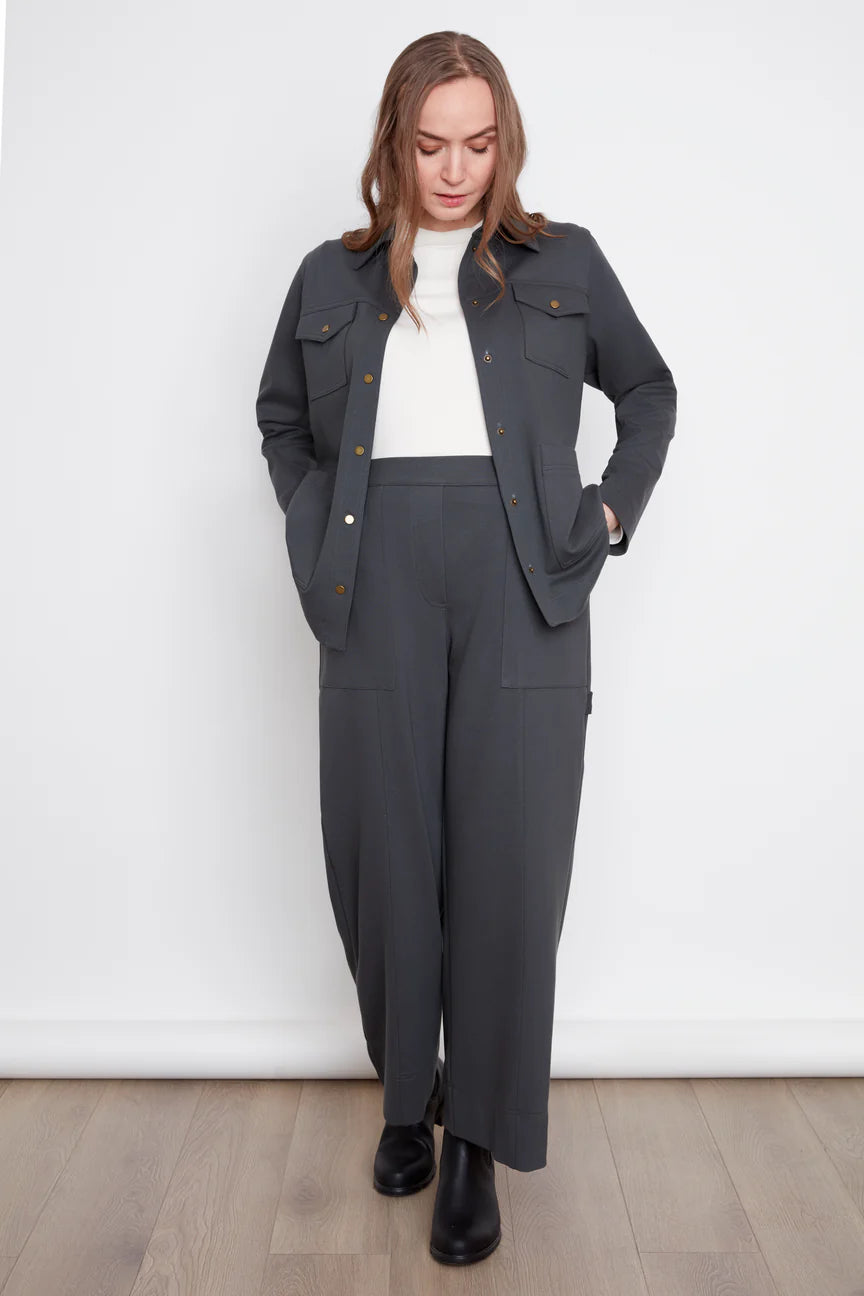 Our stretch interlock jacket from julei is worn like a shirt! Perfectly timeless. We've updated it with simplicity and a refined, workwear look. It features pretty, comfortable patch pockets, and its cutouts accentuate the waist and bust. A beautifully structured jacket with unparalleled fit and comfort. Wear it with your stretch pants as a perfect workwear duo.