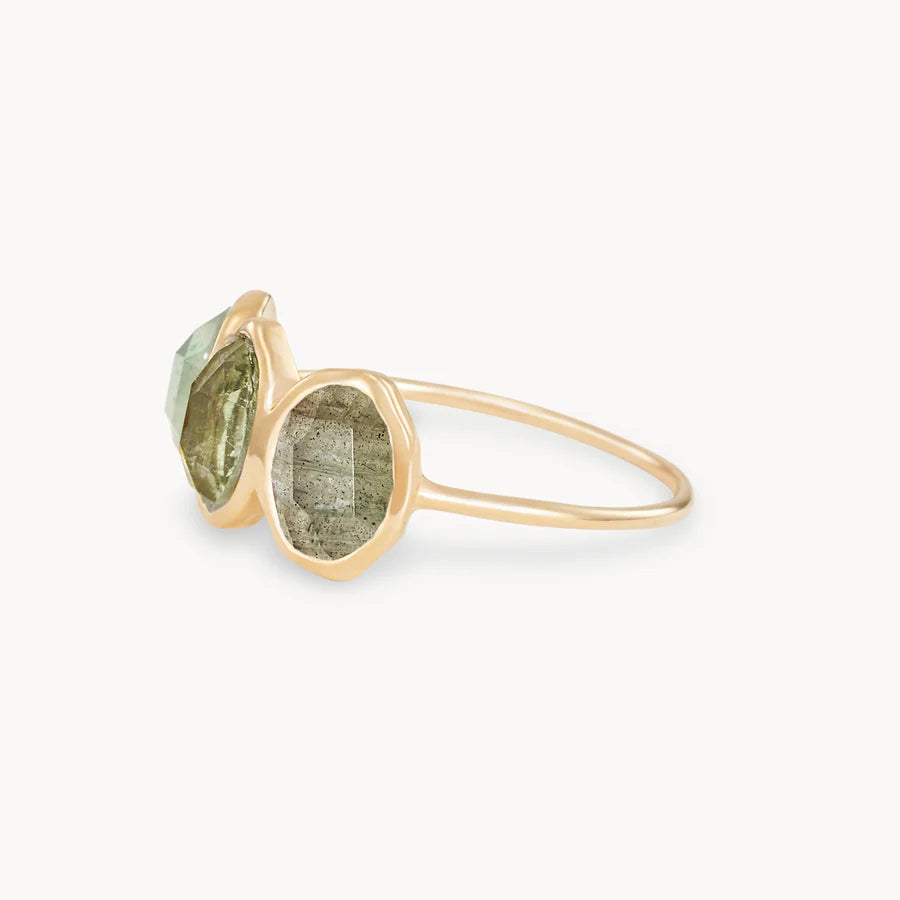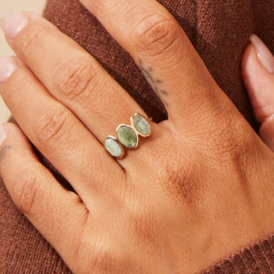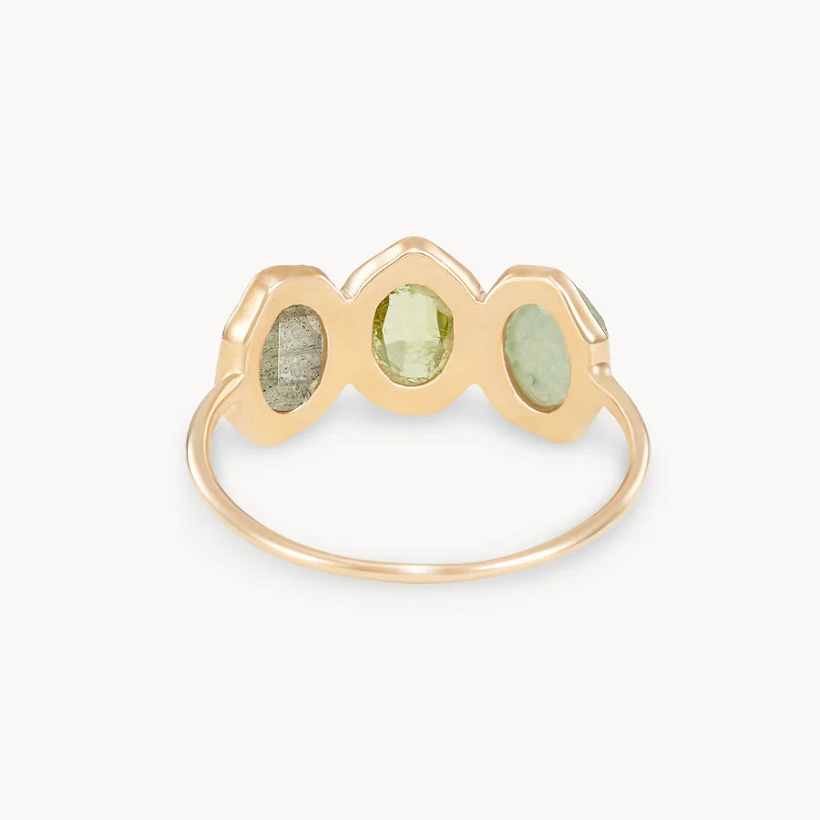 You are in your element when you are strong, steady, and grounded in the direction of your dreams. green aventurine, tourmaline, and labradorite stones reflect the power of nature's quiet depths, where grounding and a steady heart are found. cast from a hand-carved wax, the earth element mood ring reflects the strength of your desires, reminding you to stay rooted in your purpose and steady in the path ahead.