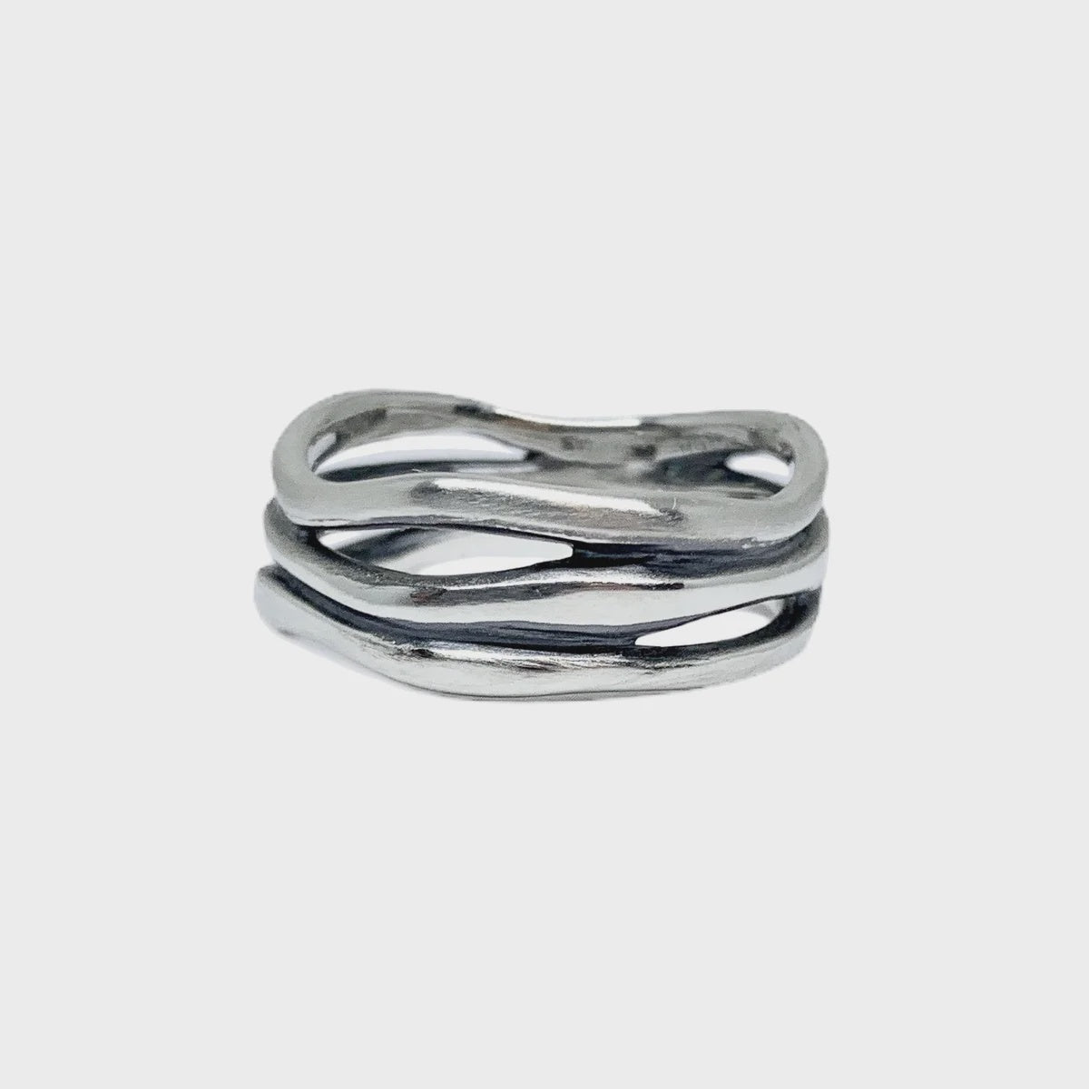 This ring is made up of three narrow organic bands with alternating finishes of satin and shine. The antique blackening in the openings emphasizes the flowing motion