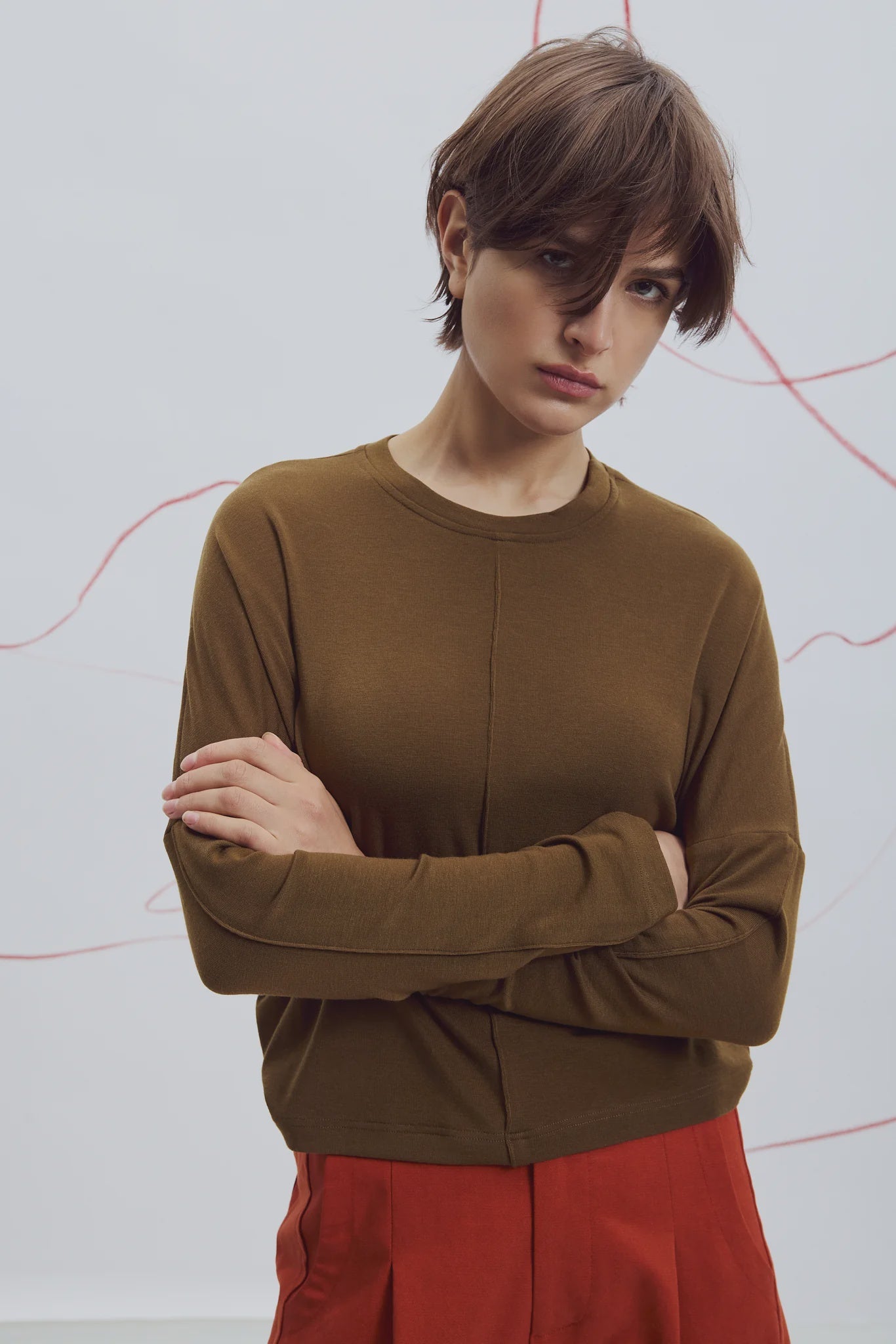 This top is part of our "basics" collection with a round neck, long sleeves, and a slightly loose fit for optimal comfort. Its ribbed details at the center front and on the top of the sleeves add a subtle and refined touch.
