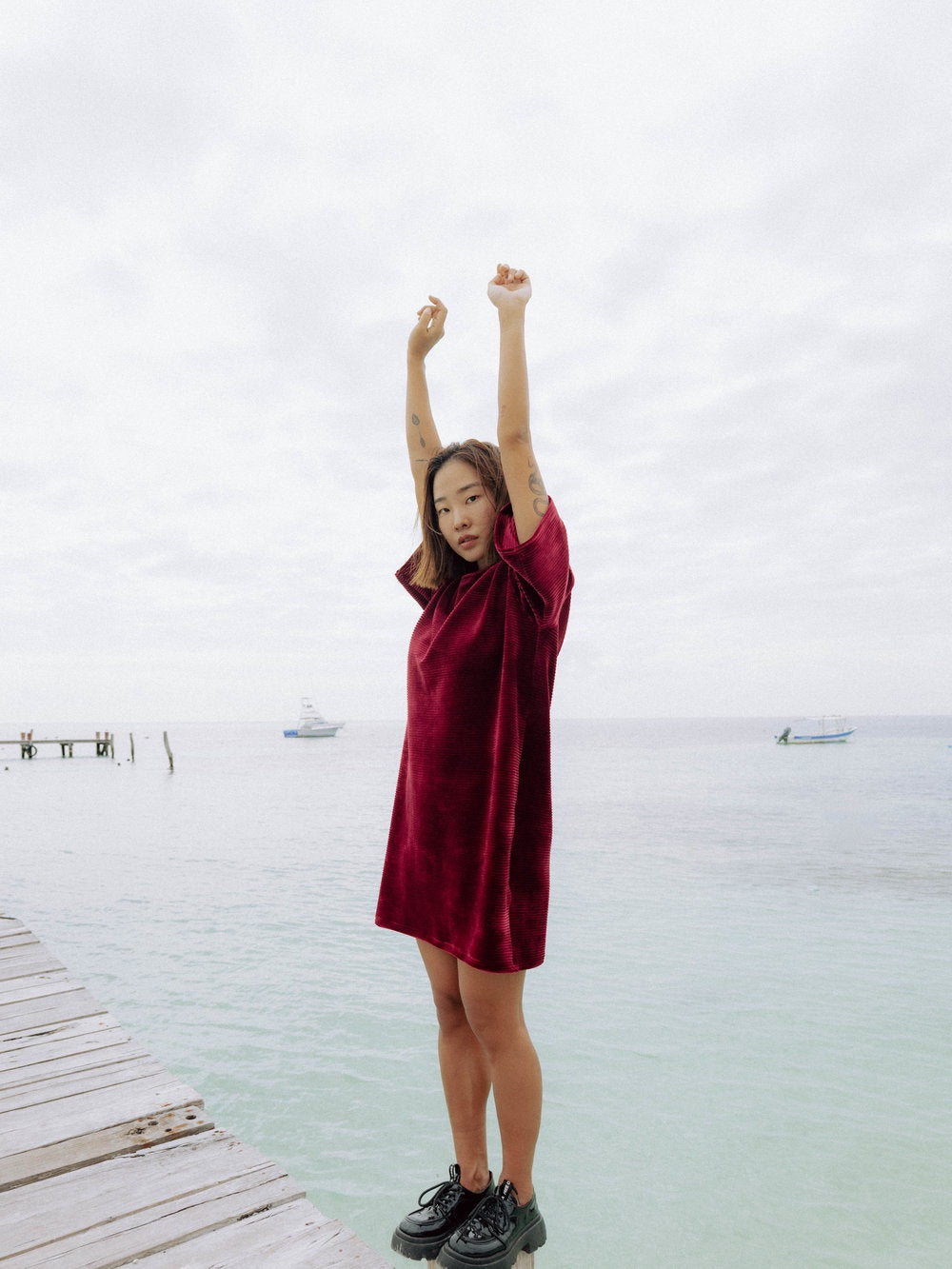 The Mykonos dress is engineered for flattering versatility. Its relaxed, slightly oversized fit provides comfortable wear while the inherent stretch of the fabric ensures it moves beautifully with your body, never clinging. The knee-length cut is universally flattering, and the luxurious texture adds depth and sophistication to any shape. It's designed to make you feel confident and effortlessly put-together.