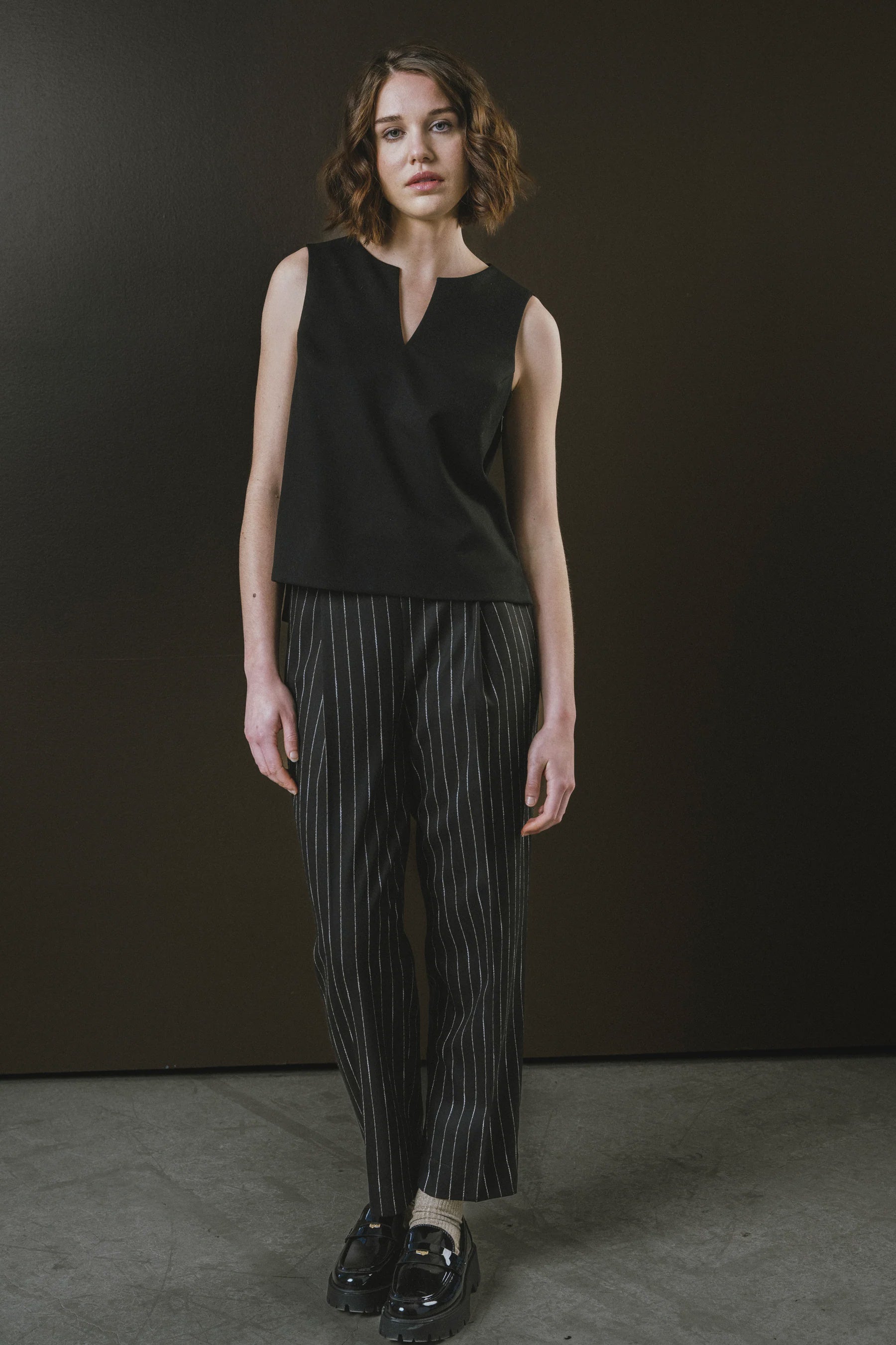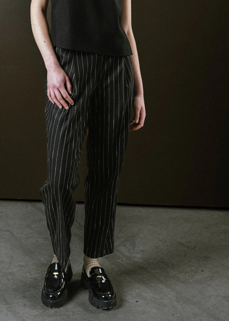 The silhouette is tapered with front pleats and an invisible side zipper, creating a clean line without the need for a belt. Finished with side pockets and a single back pocket for subtle functionality.