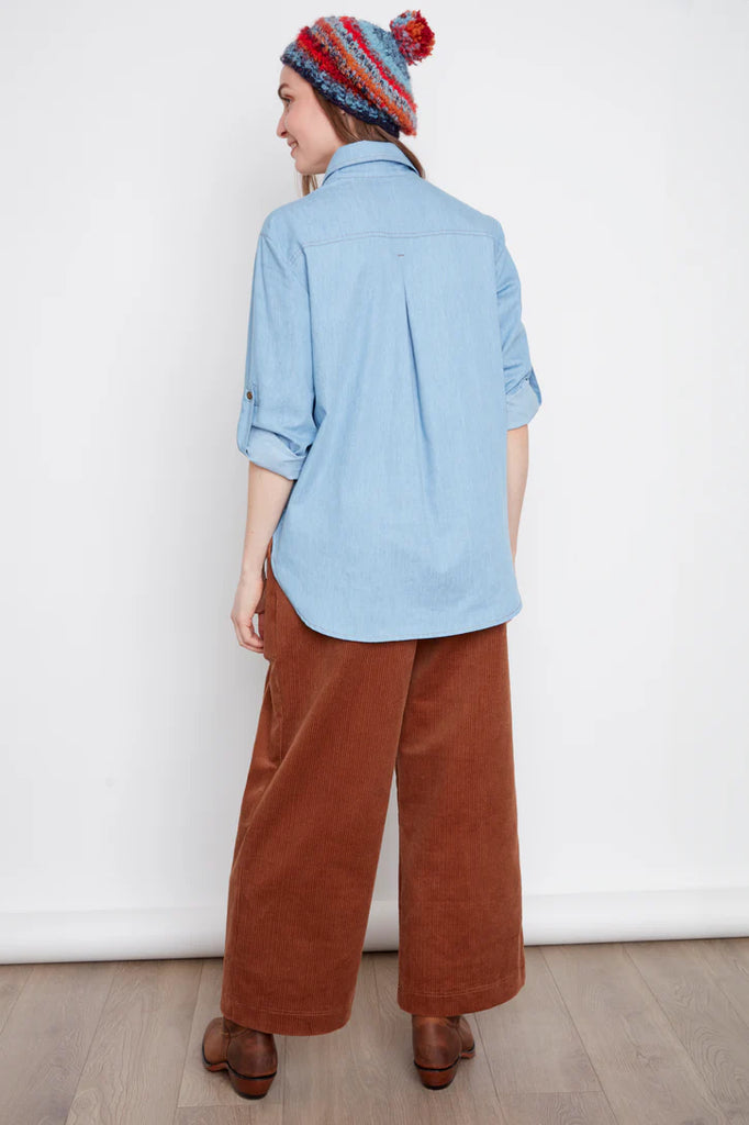 Description: Short sleeve linen top with stripe and motherof pearl buttons.n