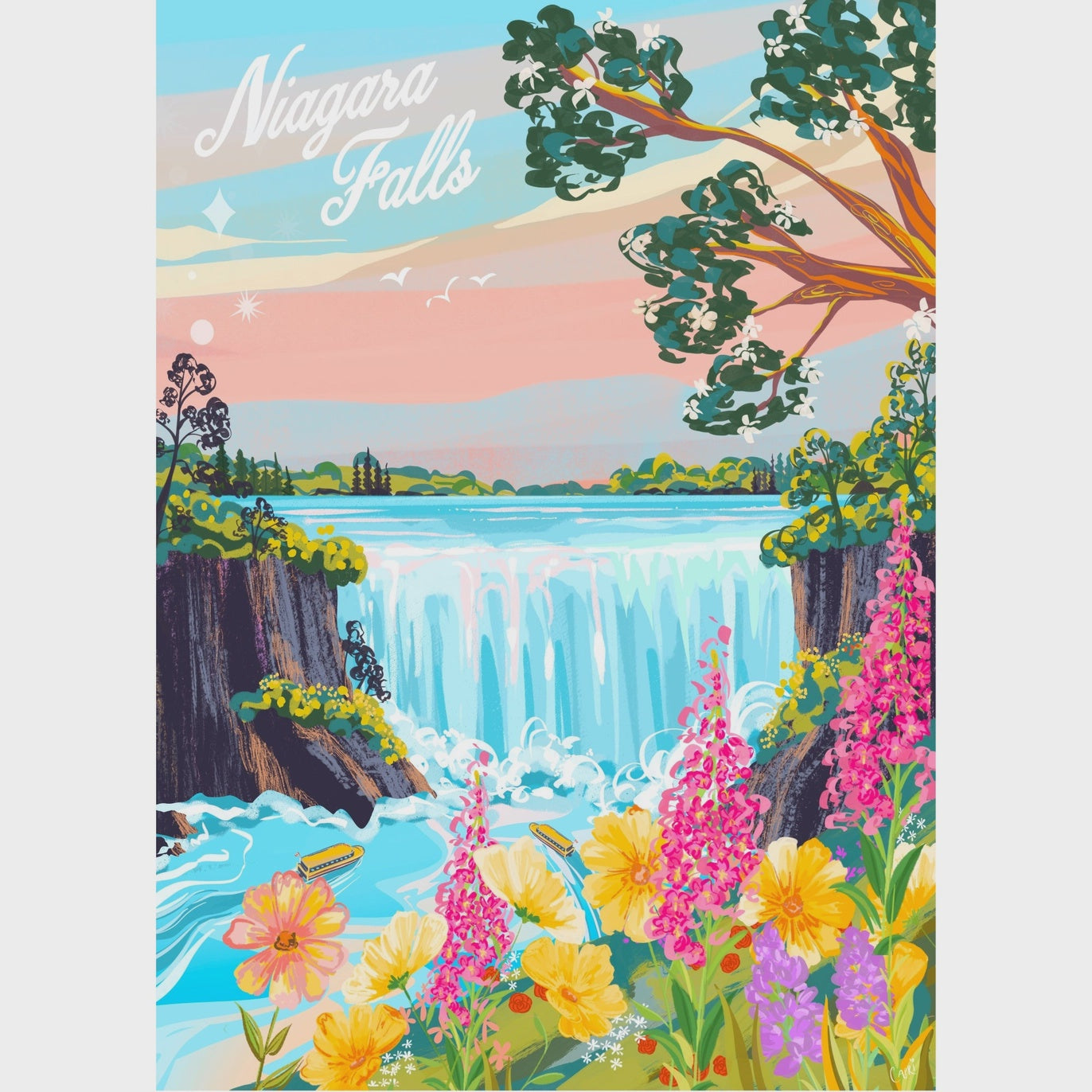 Featuring a vibrant illustrated view of Niagara Falls from a lookout above, this 500-piece puzzle captures the energy of the falls with tour boats drifting through mist and water below. Designed by BC-based artist Capri Sadler, this small batch puzzle blends travel inspiration with modern artistry—making it a standout souvenir or gift for travel lovers and a perfect pairing with Ontario, Niagara, or Canada-themed decor and prints.