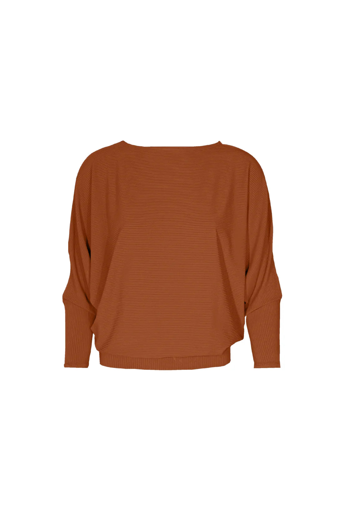 Crafted from ribbed bamboo-rayon with a touch of spandex, KLYDE offers a stretchy, comfortable fit that’s effortlessly chic. Fitted at the waist and relaxed through the body, the bat sleeves and boat neckline create a modern silhouette.