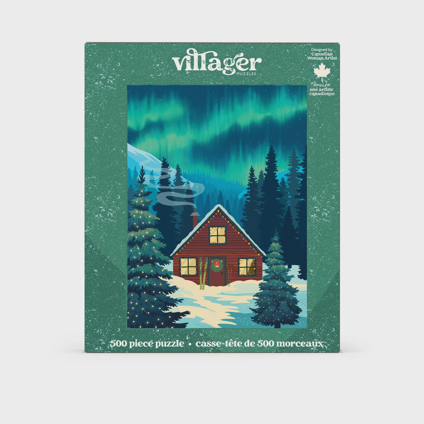 Christmas 2025 puzzle collection is now available to order. Bring the magic of a Canadian Christmas to your shelves with this enchanting puzzle featuring a cozy cabin nestled in snowy woods. Smoke curls from the chimney as the northern lights dance above, and evergreens sparkle with twinkling Christmas lights, casting a festive glow across the winter landscape—perfect for shoppers seeking a peaceful, holiday activity. Designed by Newfoundland artist Diana Pinnell, this puzzle celebrates the wonder and comfort of a northern Christmas in a modern retro style. Ideal for seasonal displays, gift guides, and holiday décor pairings. A thoughtful gift for puzzle lovers and anyone who adores cozy winter escapes.