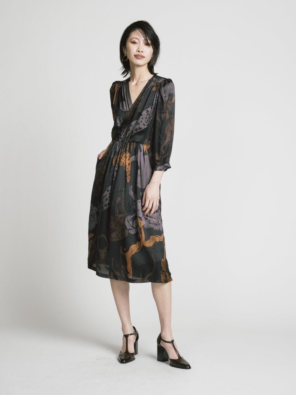 A fun AND elegant wrap front dress with a full skirt. The front top wrap has gathers at the shoulder and enough room for different bust sizes. There are gathers at the shoulder cap and cuffs and on the skirt. It’s got pockets too!! The fabric has a brown base with large horses.