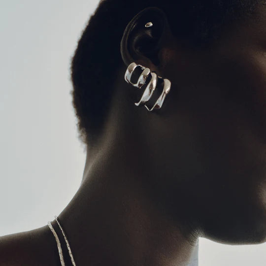 Sculptural shine in a perfectly compact form. These mirror-polished huggies are lightweight, bold, and endlessly wearable. Designed to mimic the look of a double piercing, these modern classics deliver maximum impact with minimal effort.