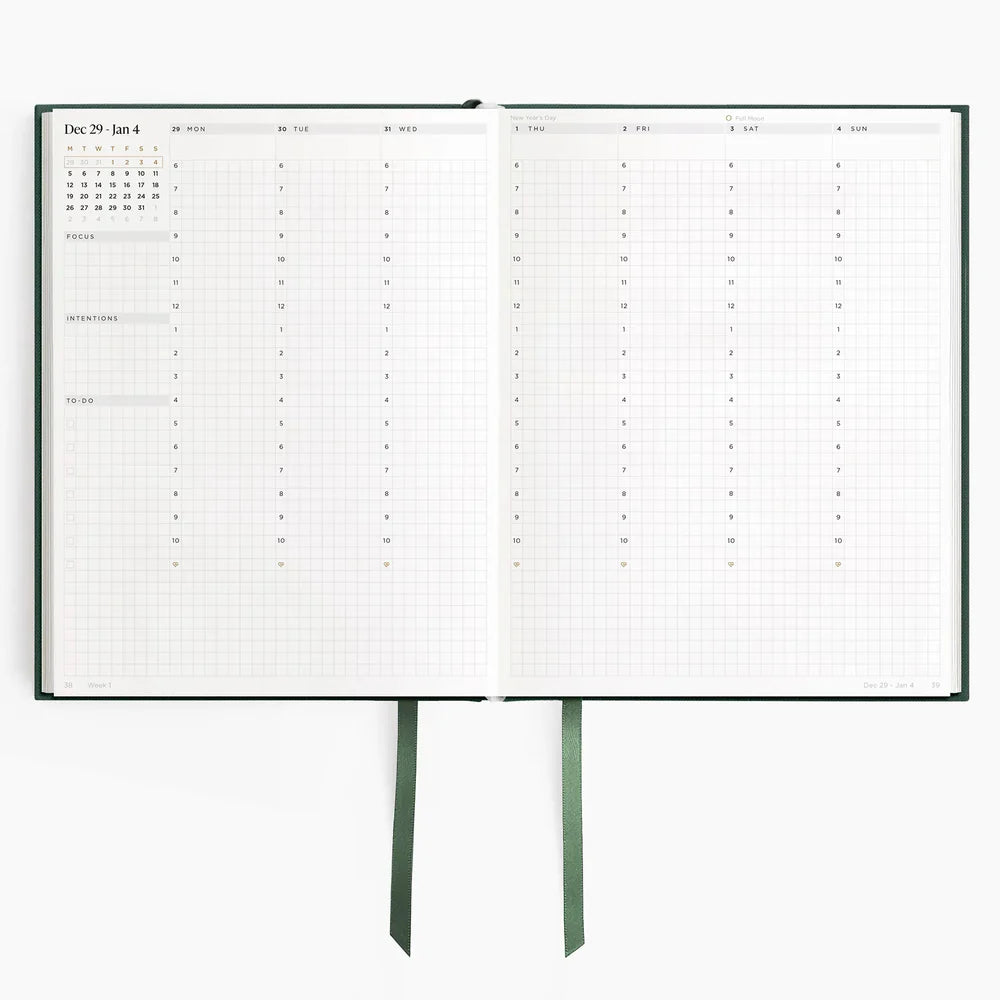Each planner is adorned with a duo of satin ribbons made from recycled plastic.
